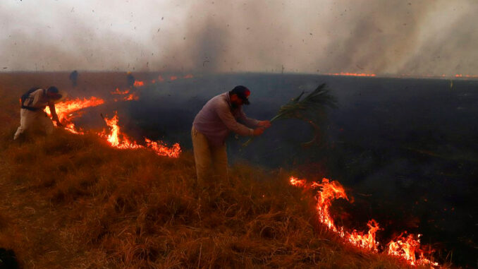 Imagens disponibilizadas do lugar mostraram grandes áreas de campos queimadas, animais fugindo do fogo ou mortos e trabalhadores exaustos lutando contra as chamas.