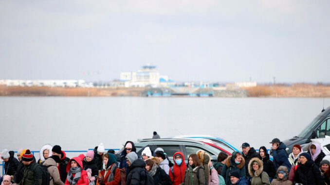 Levando em sacolas plásticas poucos objetos pessoais, moradores da cidade ucraniana de Derhachi, no Leste do país e próxima da fronteira com a Rússia, embarcaram em veículos para abandonar o local, enquanto aumenta o medo de novos bombardeios russos.
