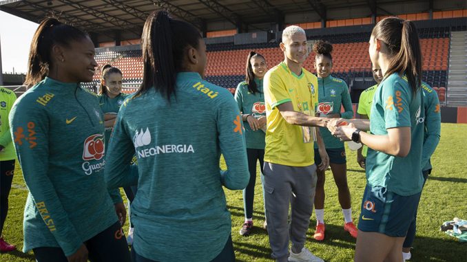 Richarlison acompanha treino da seleção feminina que entrará em campo contra Inglaterra