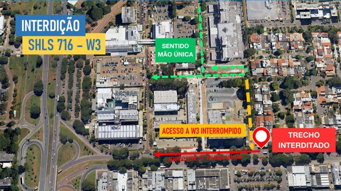 Com a evolução da obra de concretagem da faixa destinada ao transporte coletivo, o acesso ao Setor Hospitalar Sul pela via W3 Sul, na altura das quadras 715/716 Sul, será interditado, a partir desta quinta, 9, pelos próximos 30 dias. A sugestão é que o acesso às moradias situadas no local interditado seja feito pelas quadras 714/715 Sul ou pela via W4 Sul (acesso pelo Setor Policial Sul).