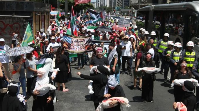 O ato em São Paulo foi organizado pela Frente em Defesa da Luta do Povo Palestino e contou com a participação de partidos políticos e movimentos sociais. Um dos gritos entoados pelos manifestantes era: “Estado de Israel, Estado assassino! Viva a luta do povo palestino!”