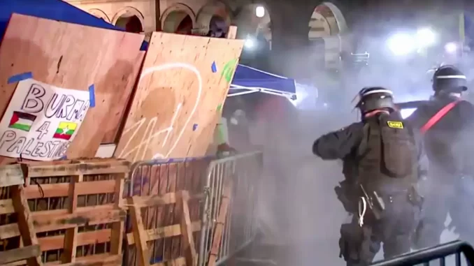 A ação policial ocorreu após horas de ameaças de detenção feitas pelos agentes por meio de alto-falantes, caso as pessoas não se dispersassem. Centenas de pessoas haviam se reunido no campus, dentro de um acampamento de tendas barricadas e ao redor dele, em apoio aos palestinos, em meio à escalada de violência entre Israel e o grupo extremista Hamas. Durante a intervenção policial, foram ouvidos sons de granadas de atordoamento, segundo relatos da AP.