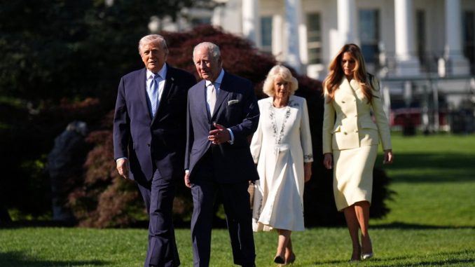 Ao lado da rainha Camilla, o monarca britânico participou de uma cerimônia oficial no Gramado Sul da Casa Branca, com honras militares, execução do hino nacional e salva de canhões. A recepção contou com a presença da primeira-dama Melania Trump e convidados, tendo ao fundo o Monumento a Washington.